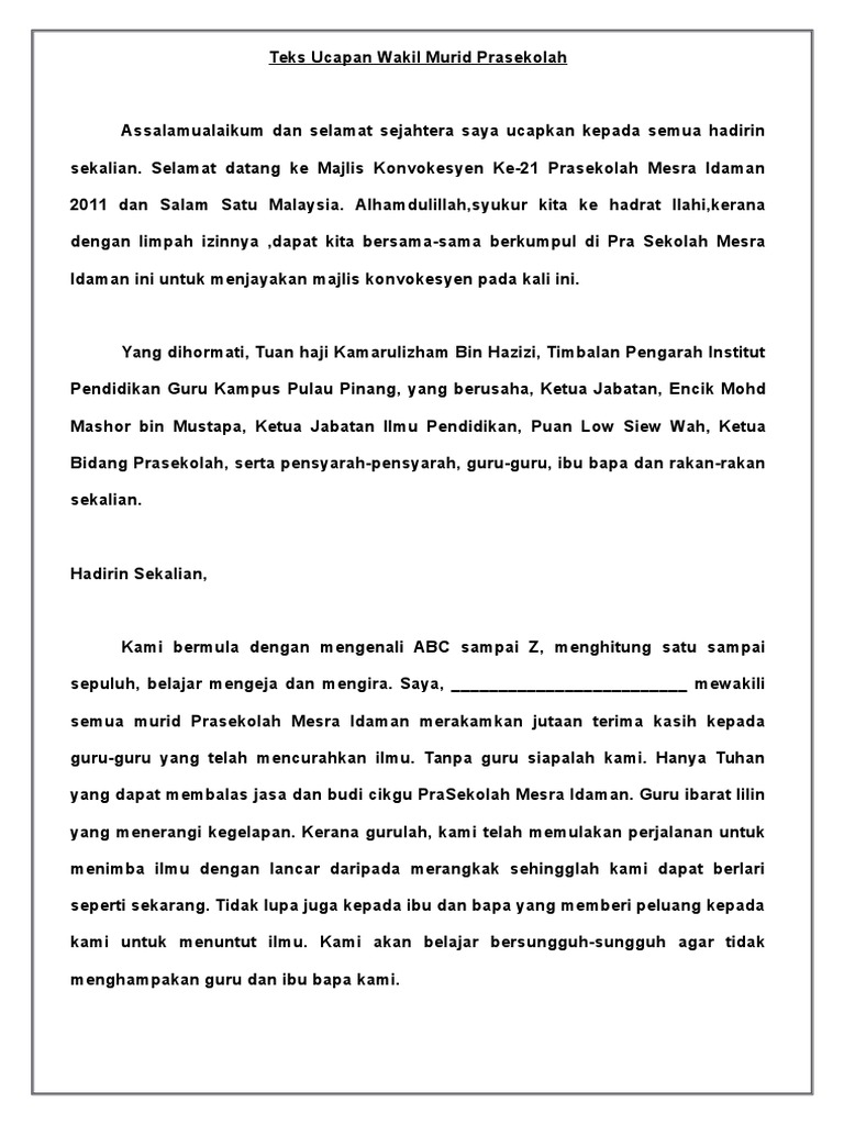 Ucapan konvokesyen tadika. Purnama Ungu Contoh Kertas Kerja Mini Konvokesyen Prasekolah. Selamat datang juga diucapkan kepada semua tetamu ibu bapa serta hadirin-hadirat sekalian. Sebuah hiasan pentas kayu lama terdiri daripada dua panel kayu dengan ukiran tulisan jawi diserahkan kepada Unit Galerium pada 10 Ogos 2016.